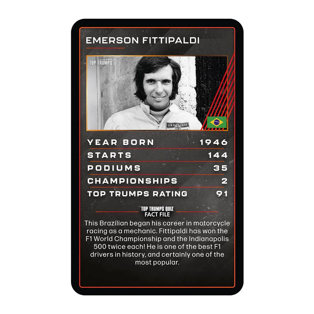 Since 1950, only the most skilled and courageous racing drivers have managed to earn the chance to compete in the most prestigious motorsport championship, Formula 1, racing fiercely all around the world to be crowned the next King of Speed while risking their lives at every turn. Whilst driving these amazing, finely-tuned cars is no more than a dream for most of us, it's just another day at the office for the likes of Hamilton, Verstappen, Vettel, and the rest of the pilots of the grid. They make up the highest echelon of motorsport, and in this new Top Trumps pack you can discover precisely how these legends helped make Formula 1 the pinnacle of sophistication and technology that it is today. So how does Lewis Hamilton compare with the legendary Michael Schumacher? Who has the most starts in Formula 1? Grab your pack and start your engine to find out!